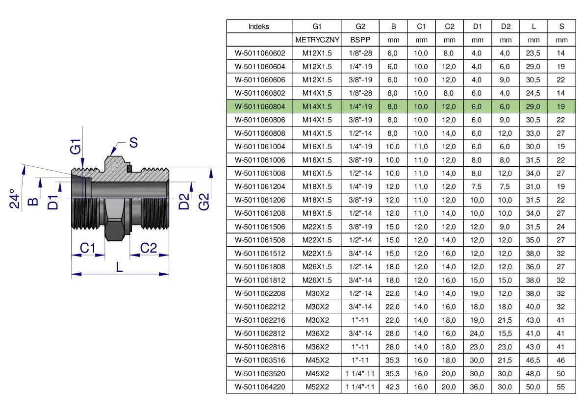 Przyłączka hydrauliczna BB (XGE) M14x1.5 08L x 1/4″ BSP ED Waryński. Elementy złączne zostały zaprojektowane i wykonane zgodnie z obowiązującymi normami, które szczegółowo opisują wymagania jakościowe i wymiarowe. Są kompatybilne z elementami złącznymi innych renomowach producentów hydrauliki siłowej.