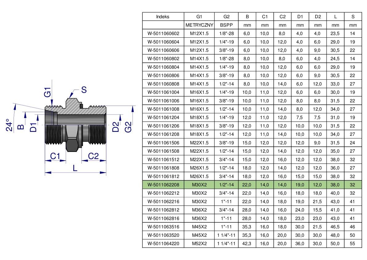 Przyłączka hydrauliczna BB (XGE) M30x2 22L x 1/2″ BSP ED Waryński ( sprzedawane po 2 ) [W-5011062208]