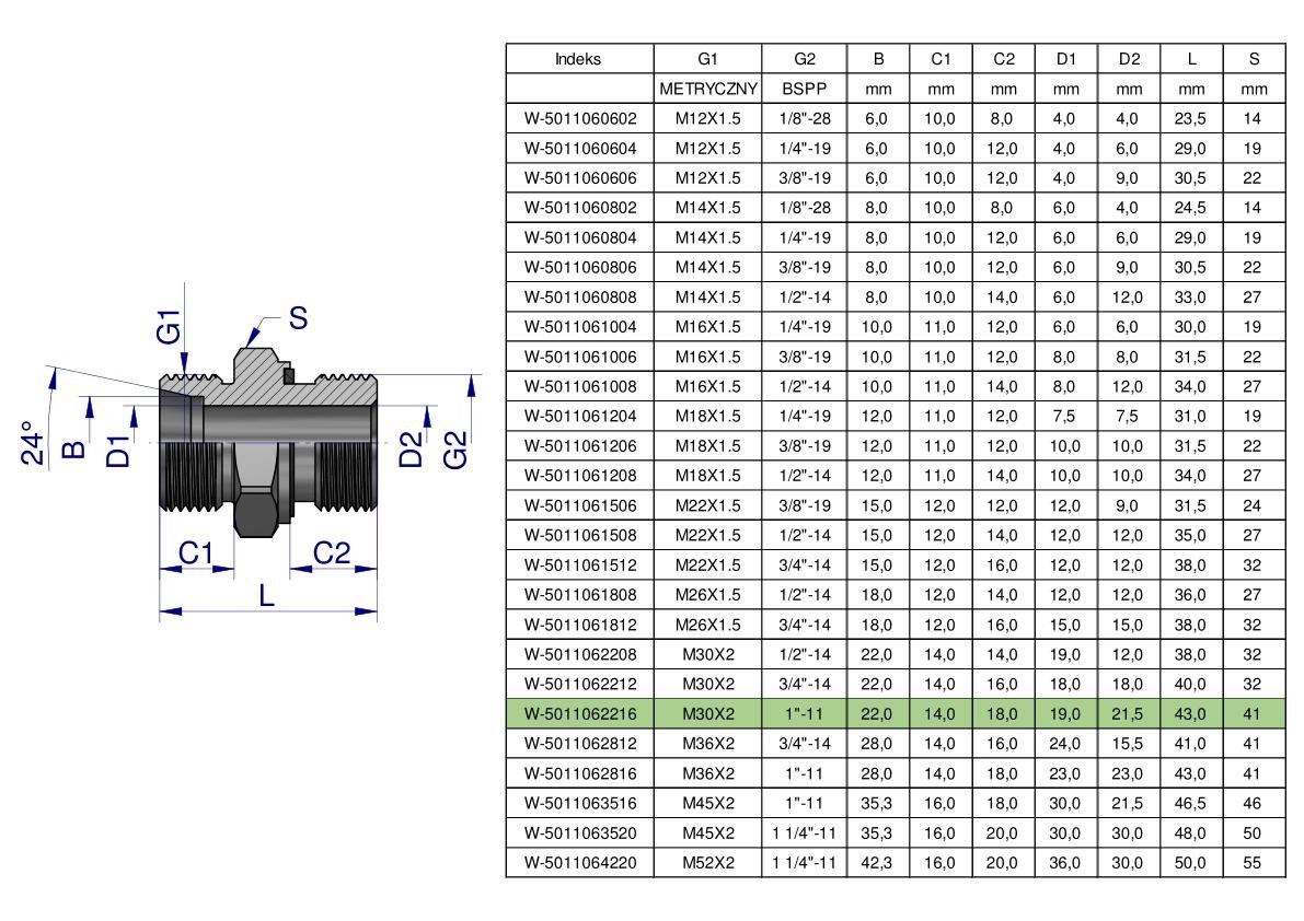 Przyłączka hydrauliczna BB (XGE) M30x2 22L x 1″ BSP ED Waryński ( sprzedawane po 2 ) [W-5011062216]