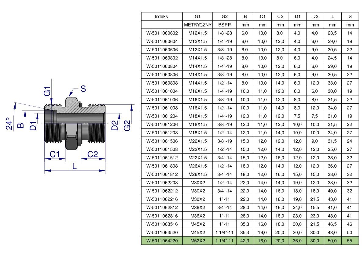 Przyłączka hydrauliczna BB (XGE) M52x2 42L x 1 1/4″ BSP ED Waryński [W-5011064220]