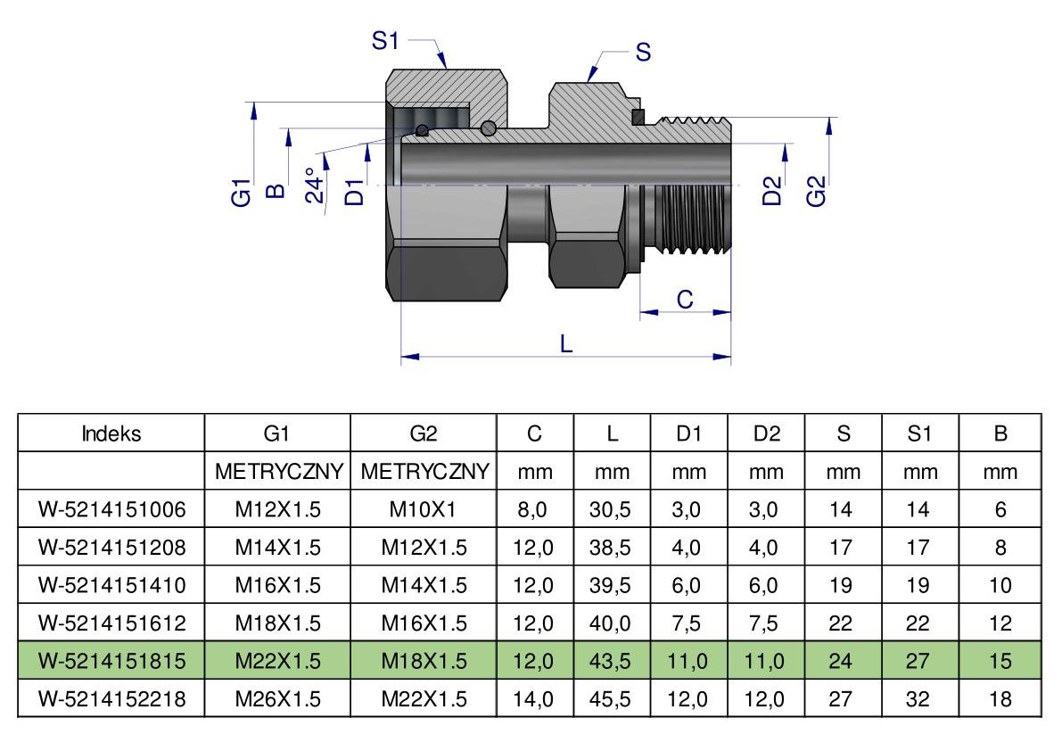 Przyłączka hydrauliczna metryczna AB (EVGE) M22x1.5 15L x M18x1.5 ED Waryński ( sprzedawane po 2 ) [W-5214151815]
