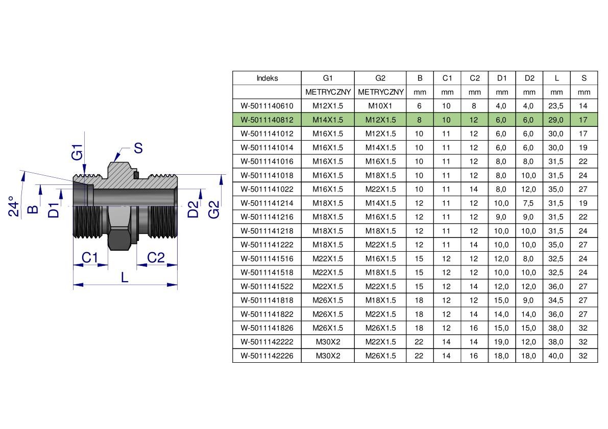 Przyłączka hydrauliczna metryczna BB (XGE) M14x1.5 08L x M12x1.5 ED Waryński ( sprzedawane po 5 ) [W-5011140812]