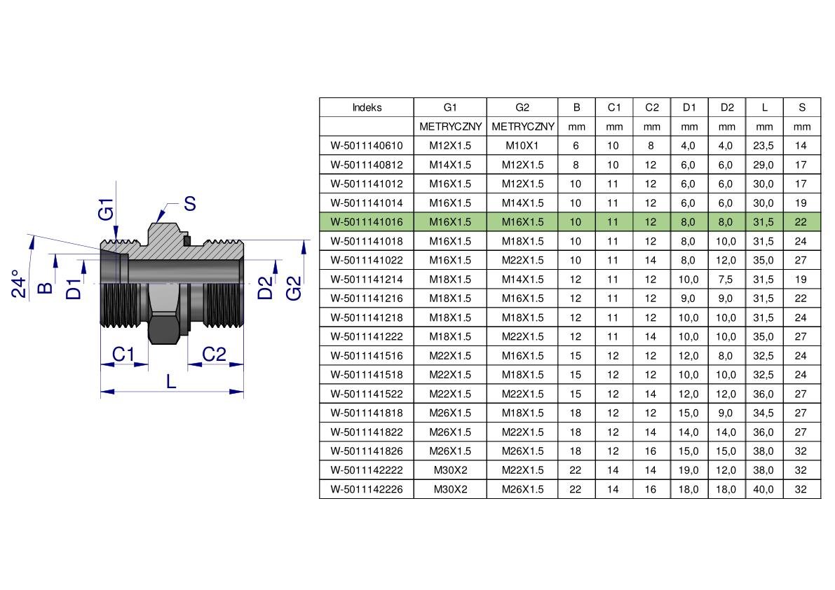 Przyłączka hydrauliczna metryczna BB (XGE) M16x1.5 10L x M16x1.5 ED Waryński ( sprzedawane po 5 ) [W-5011141016]
