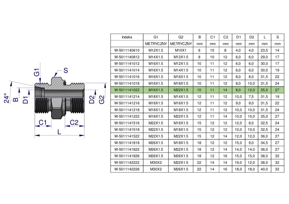 Przyłączka hydrauliczna metryczna BB (XGE) M16x1.5 10L x M22x1.5 ED Waryński ( sprzedawane po 5 ) [W-5011141022]
