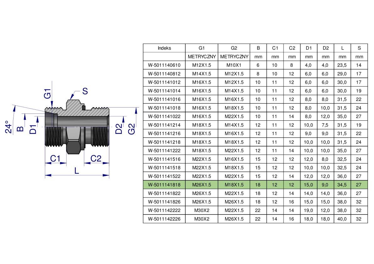 Przyłączka hydrauliczna metryczna BB (XGE) M26x1.5 18L x M18x1.5 ED Waryński ( sprzedawane po 2 ) [W-5011141818]