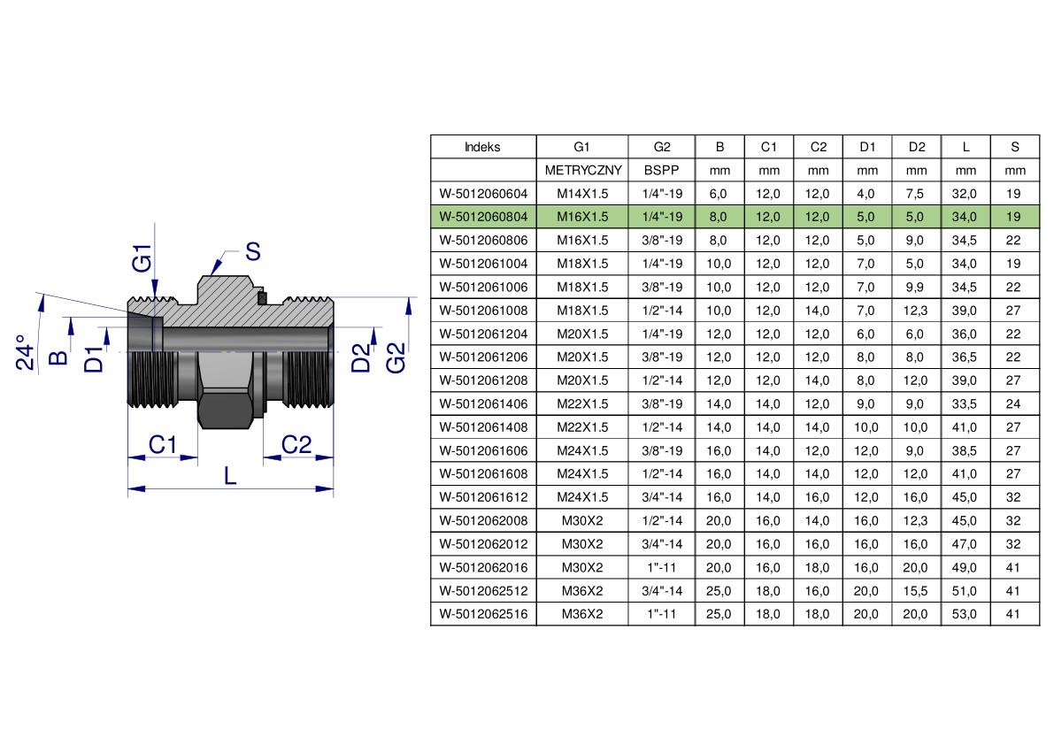 Przyłączka hydrauliczna (odmiana ciężka XGE) BB M16x1.5 08S x 1/4″ BSP ED Waryński ( sprzedawane po 5 ) [W-5012060804]