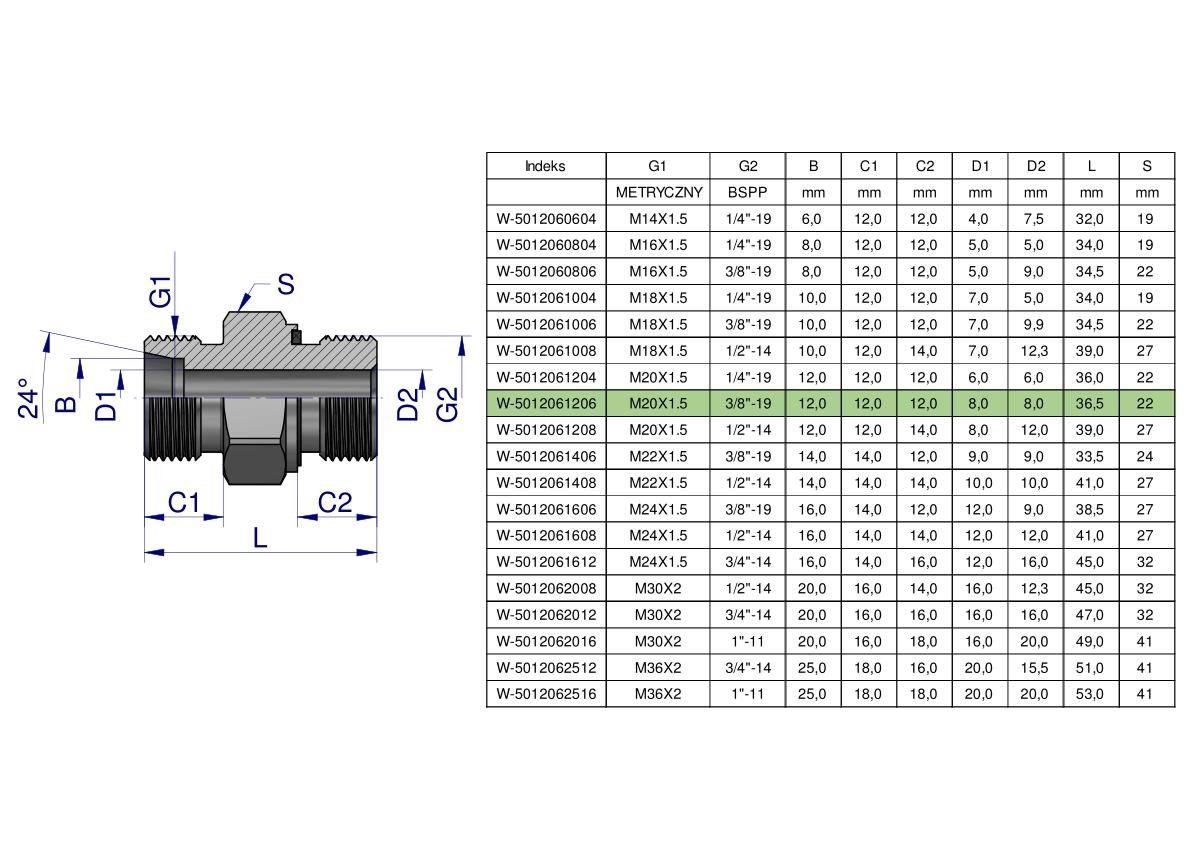 Przyłączka hydrauliczna (odmiana ciężka XGE) BB M20x1.5 12S x 3/8″ BSP ED Waryński ( sprzedawane po 5 ) [W-5012061206]
