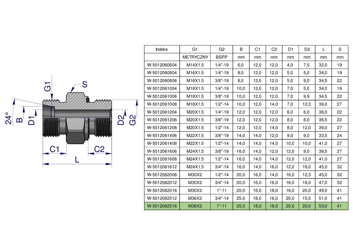 Przyłączka hydrauliczna (odmiana ciężka XGE) BB M36x2 25S x 1″ BSP ED Waryński ( sprzedawane po 2 ) [W-5012062516]