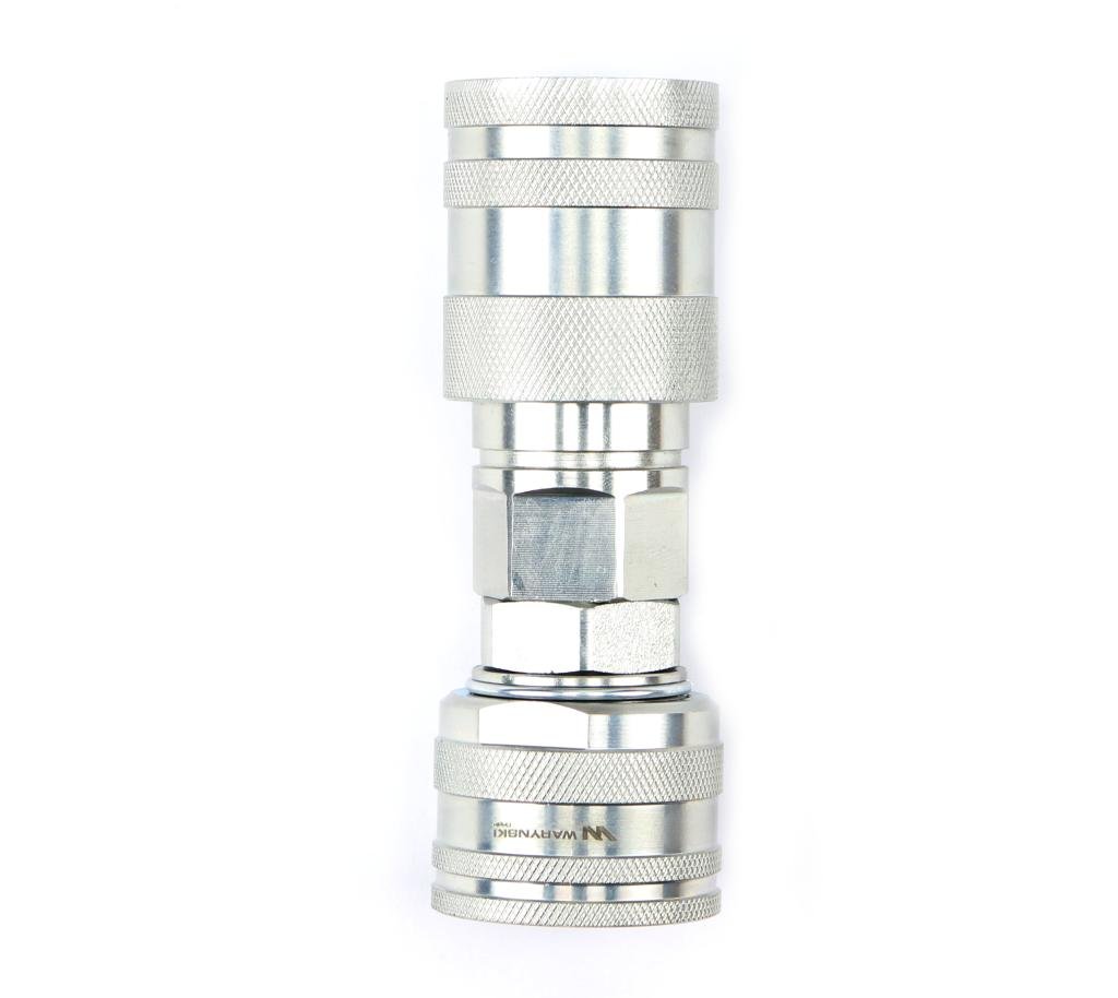 Redukcja wtyczka/gniazdo EURO PUSH-PULL z eliminatorem ciśnienia skręcane (50493REDUKCJA) Waryński – z jednej strony zamontowana wtyczka skręcana rolnicza starego typu a z drugiej strony gniazdo z eliminatorem ciśnienia EURO (ISO-7241-A) w wersji Push-Pull. Eliminator ciśnienia umożliwia połączenie hydrauliki bez potrzeby stosowania nadmiernej siły, co zapewnia szybki i łatwy proces połączenia w każdej sytuacji (statyczne ciśnienie pomiędzy dwoma systemami hydraulicznymi jest rozprężane).Najpopularniejsze zawory redukcyjne hydrauliczne o bardzo szerokim spektrum zastosowań w rolnictwie. Zaprojektowane są zgodnie z wymogami wymiarowymi i jakościowymi, które określają szczegółowo charakterystykę pracy i wymiary. Dzięki mocnej kontrukcji nadają się do zastosowań podczas trudnych warunków pracy maszyny rolniczej. Dzięki zaworom redukcyjnym można łatwo zmienić przyłącze pod wyższy standard szybkozłączy hydraulicznych EURO (ISO-7241-A) Waryński w wersji standardowej i wersji Push-Pull.