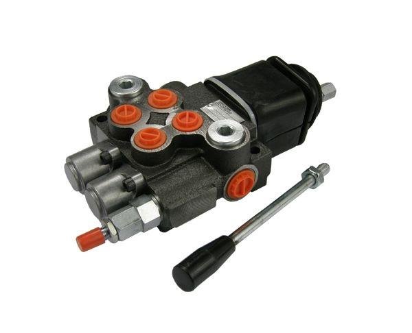 Rozdzielacz 2-sekcyjny 40L z joystickiem – monoblokowy z układem równoległym z neutralną pozycją środkową, sterowany za pomocą 1 dźwigni (joystick). Olej w pozycji neutralnej krąży między pompą hydrauliczną a zbiornikiem Badestnost