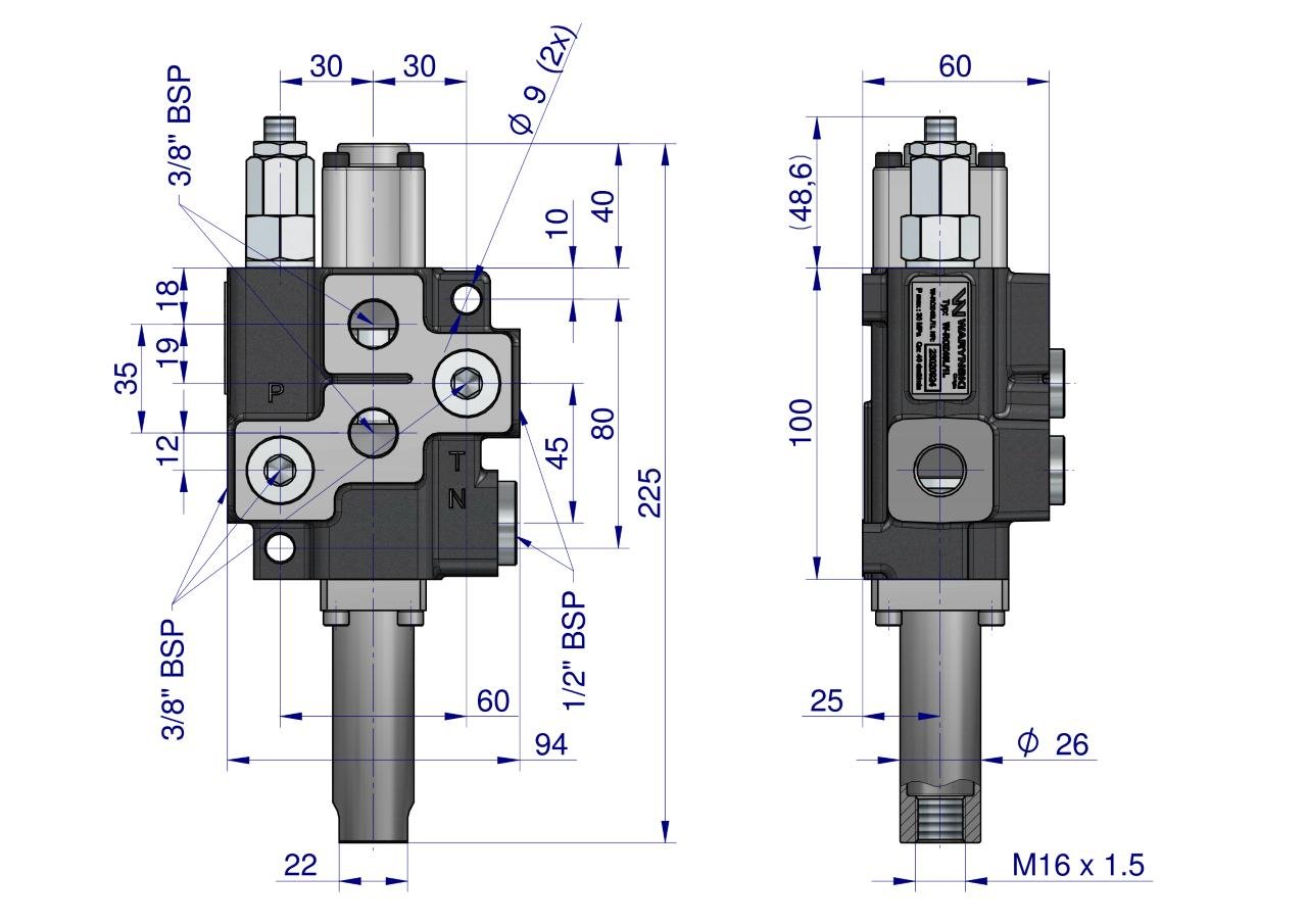 Rozdzielacz hydrauliczny 1-sekcyjny max przepływ 40L sterowany na linkę Waryński