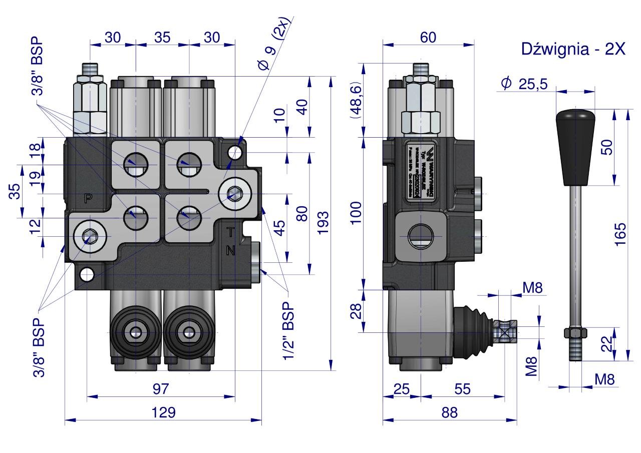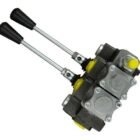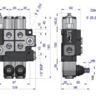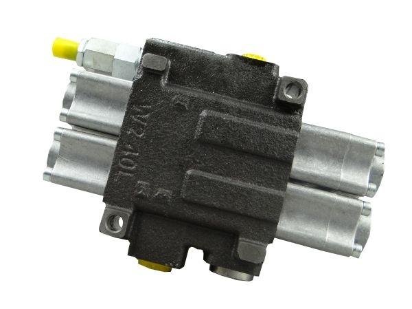 Rozdzielacz hydrauliczny 2-sekcyjny Waryński – monoblokowy z układem równoległym z neutralną pozycją środkową z zatrzaskiem na 2 sekcjach.