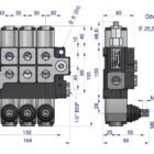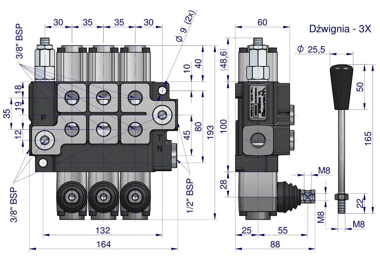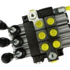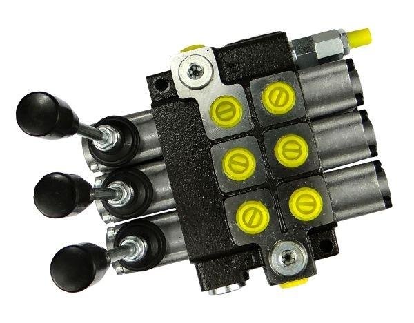 Rozdzielacz hydrauliczny 3-sekcyjny Waryński – monoblokowy z układem równoległym z neutralną pozycją środkową z zatrzaskiem na 3 sekcjach.