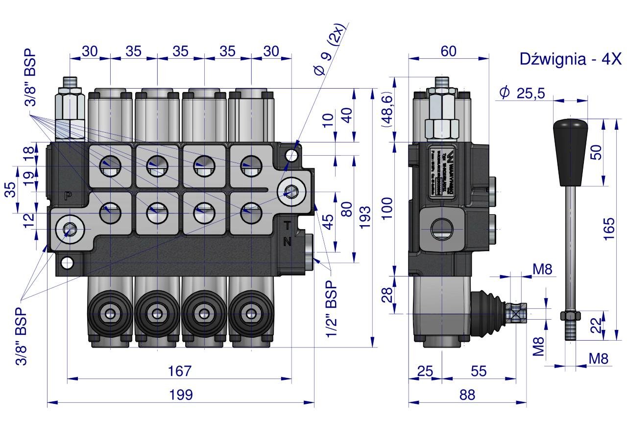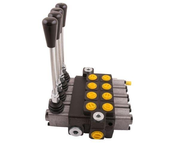 Rozdzielacz hydrauliczny 4-sekcyjny max przepływ 40L (1 sekcja z zatrzaskiem) Waryński – monoblokowy z układem równoległym z neutralną pozycją środkową.