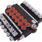 Rozdzielacz hydrauliczny 6-sekcyjny sterowany elektrycznie (12V) 50L – monoblokowy z układem równoległym z neutralną pozycją środkową. Olej w pozycji neutralnej krąży między pompą hydrauliczną a zbiornikiem Badestnost