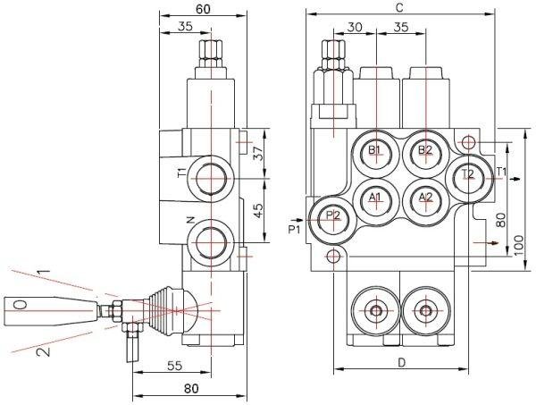 Rozdzielacz hydrauliczny dwusekcyjny 1-sekcja pływająca 40L – monoblokowy z układem równoległym z neutralną pozycją środkową. Olej w pozycji neutralnej krąży między pompą hydrauliczną a zbiornikiem. Jedna sekcja: pływająca (z zatrzaskiem) Badestnost