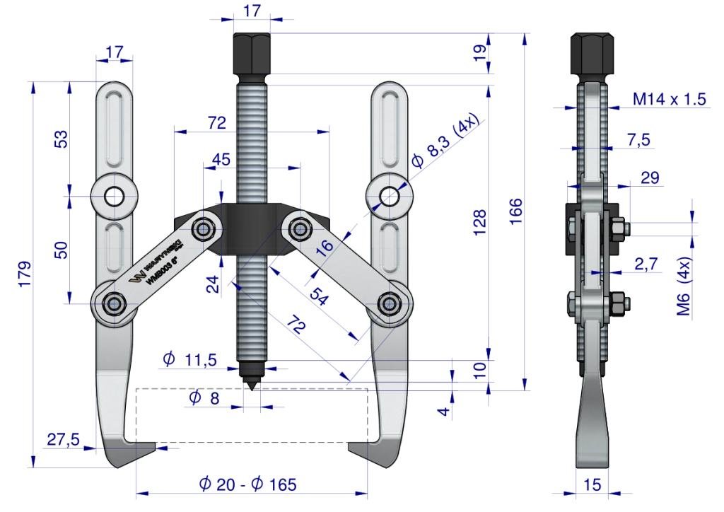 Ściągacz do łożysk dwuramienny o rozstawie hartowanych ramion roboczych 20-165 mm Waryński