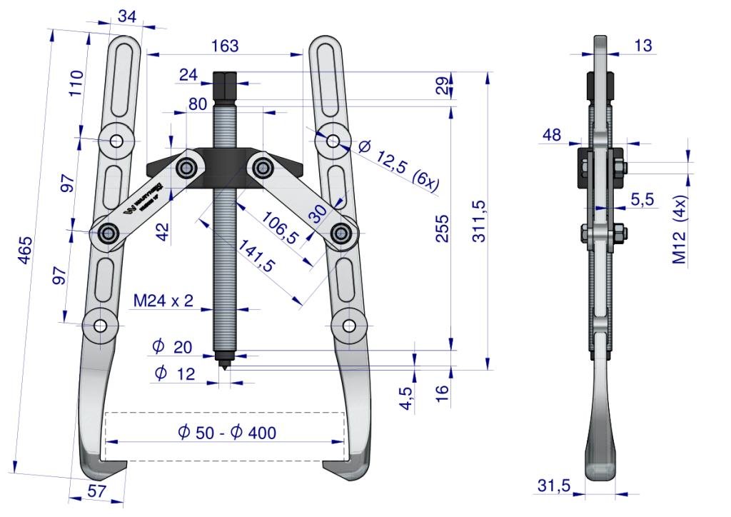 Ściągacz do łożysk dwuramienny o rozstawie hartowanych ramion roboczych 50-500 mm Waryński