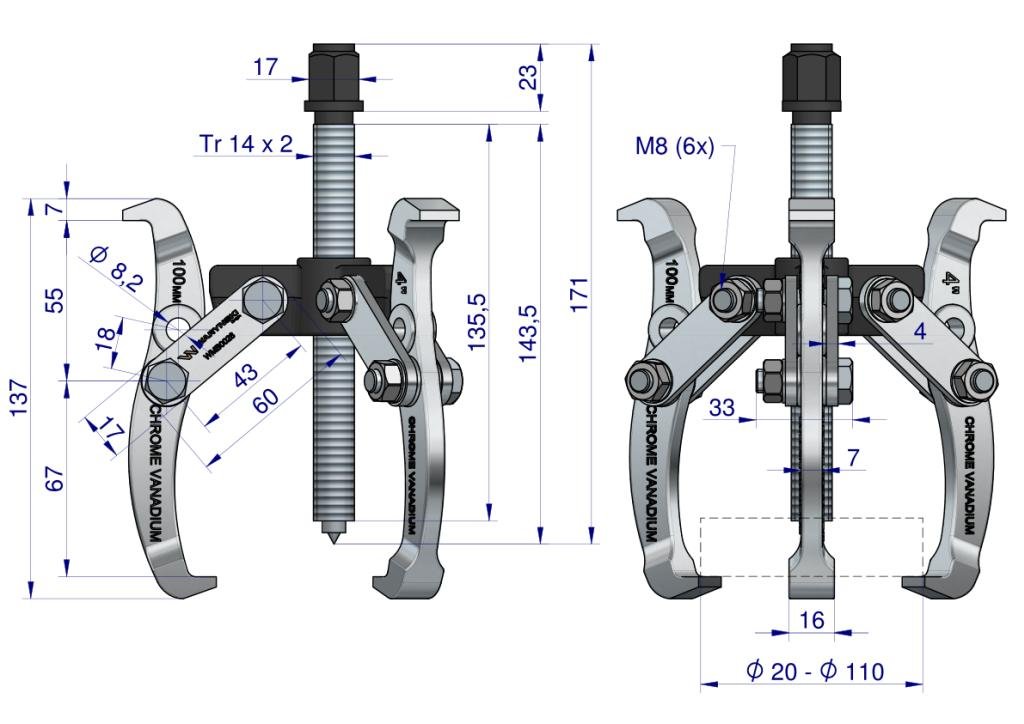 Ściągacz do łożysk trójramienny typ S o rozstawie hartowanych ramion roboczych 20-110 mm Waryński