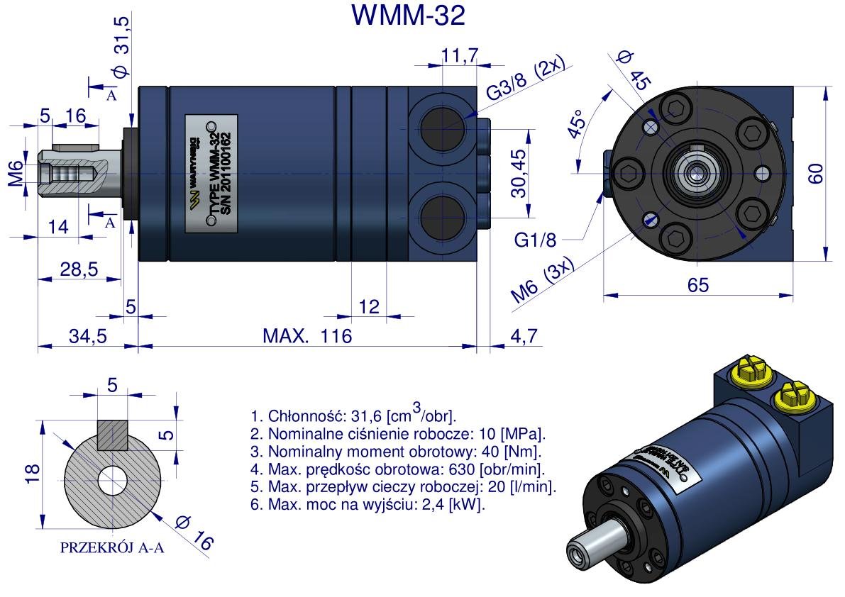 Silnik hydrauliczny orbitalny WMM 32 cm³/obr (100 bar / max.140 bar / max.chwilowe 160 bar) Waryński. Silniki serii WMM (boczne przyłącze) mają lekką kompaktową konstrukcję, wysoki moment obrotowy. Możliwość połączenia równolegle lub szeregowo. W celu osiągnięcia dłuższej żywotności zaleca się, aby opytamalne waryunki pracy były na poziomie 1/3 do 2/3 parametrów maksymalnych. Silniki serii WMM należą do szeregu małych silników orbitalnych.