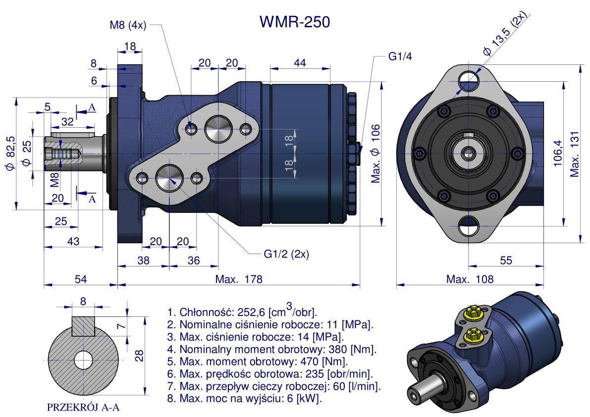 Silnik hydrauliczny orbitalny WMR 250 cm³/obr (110 bar / max.140 bar / max.chwilowe 160 bar) Waryński. Silniki serii WMR mają lekką kompaktową konstrukcję, wysoki moment obrotowy. Możliwość połączenia równolegle lub szeregowo. W celu osiągnięcia dłuższej żywotności zaleca się, aby opytamalne waryunki pracy były na poziomie 1/3 do 2/3 parametrów maksymalnych.