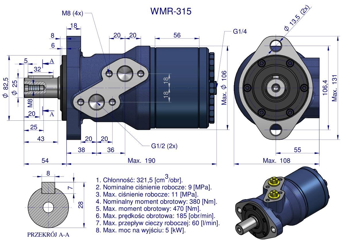 Silnik hydrauliczny orbitalny WMR 315 cm³/obr (90 bar / max.110 bar / max.chwilowe 130 bar) Waryński. Silniki serii WMR mają lekką kompaktową konstrukcję, wysoki moment obrotowy. Możliwość połączenia równolegle lub szeregowo. W celu osiągnięcia dłuższej żywotności zaleca się, aby opytamalne waryunki pracy były na poziomie 1/3 do 2/3 parametrów maksymalnych.