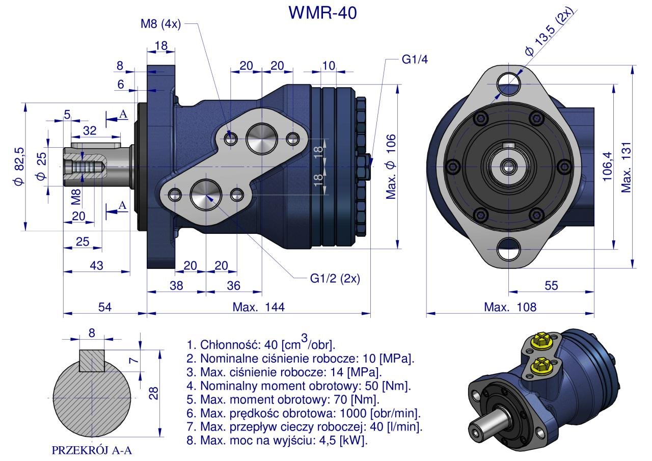 Silnik hydrauliczny orbitalny WMR 40 cm³/obr (100 bar / max.200 bar) Waryński. Silniki serii WMR mają lekką kompaktową konstrukcję, wysoki moment obrotowy. Możliwość połączenia równolegle lub szeregowo. W celu osiągnięcia dłuższej żywotności zaleca się, aby opytamalne waryunki pracy były na poziomie 1/3 do 2/3 parametrów maksymalnych.
