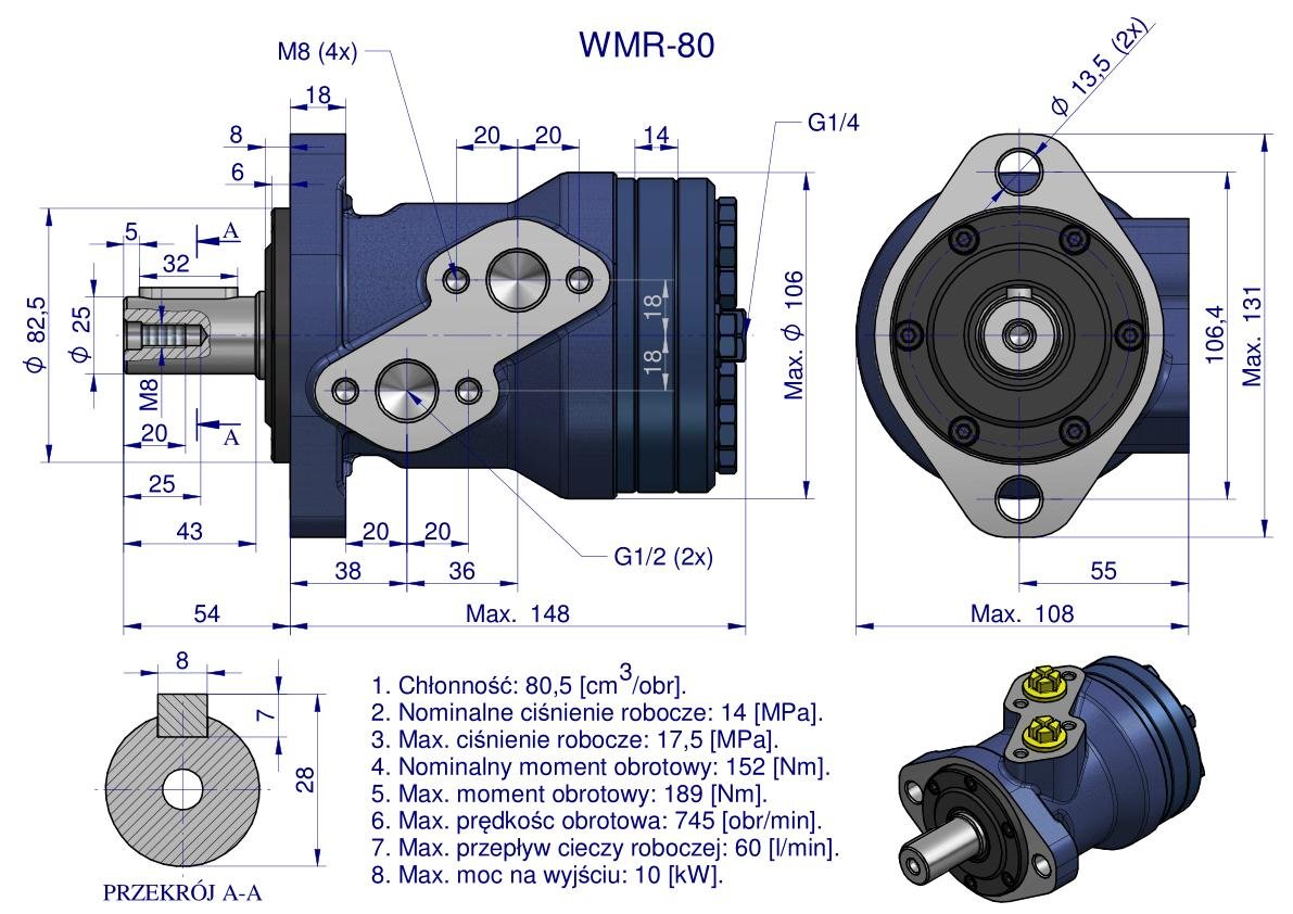 Silnik hydrauliczny orbitalny WMR 80 cm³/obr (140 bar / max.175 bar / max.chwilowe 200 bar) Waryński. Silniki serii WMR mają lekką kompaktową konstrukcję, wysoki moment obrotowy. Możliwość połączenia równolegle lub szeregowo. W celu osiągnięcia dłuższej żywotności zaleca się, aby opytamalne waryunki pracy były na poziomie 1/3 do 2/3 parametrów maksymalnych.