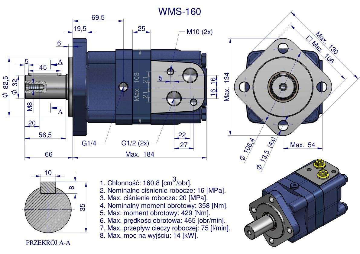 Silnik hydrauliczny orbitalny WMS 160 cm³/obr (160 bar / max.200 bar / max.chwilowe 225 bar) Waryński. Silniki serii WMS charakteryzują się kompaktową konstrukcją, wysokim momentem obrotowym, dużą chłonnością. Dystrybucja dyskowa zapewnia wysoką efektywność, sprawność, płynną pracę oraz długą żywotność. Wzmocnione uszczelnienie wału umożliwia zarówno szeregowe, jak i równoległe połączenia silników. W celu osiągnięcia dłuższej żywotności zaleca się, aby opytamalne waryunki pracy były na poziomie 1/3 do 2/3 parametrów maksymalnych.
