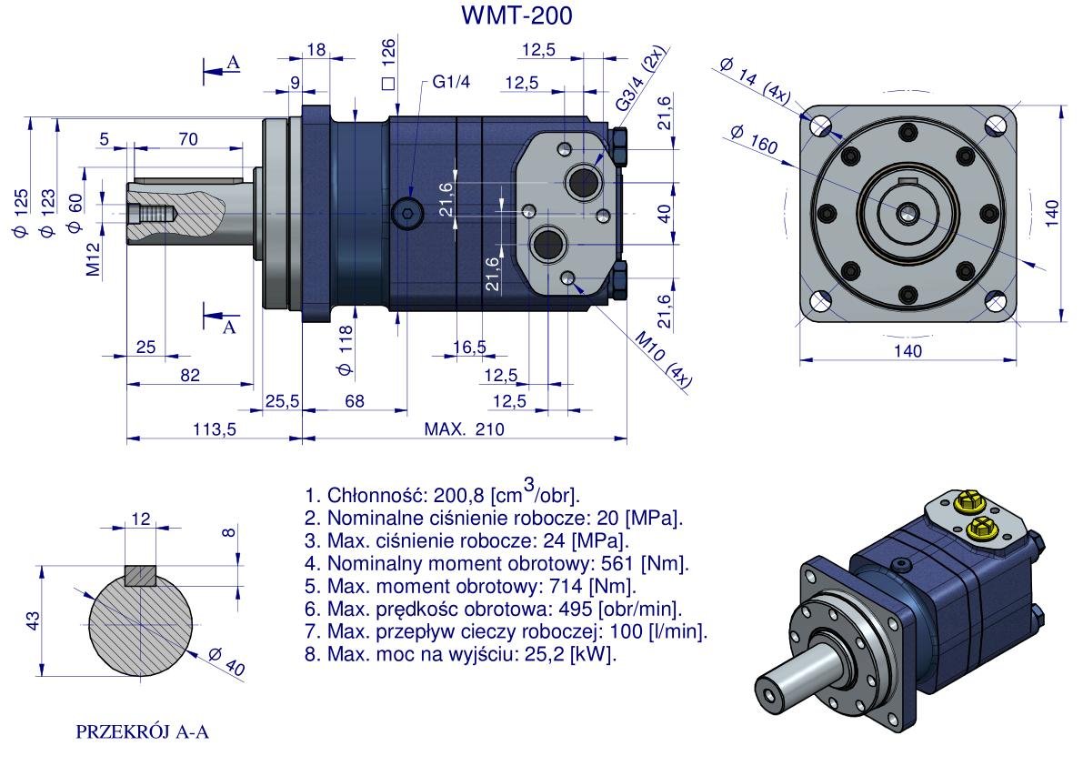 Silnik hydrauliczny orbitalny WMT 200 cm³/obr (200 bar / max.240 bar / max.chwilowe 280 bar) Waryński. Silniki serii WMT charakteryzują się kompaktową konstrukcją, wysokim momentem obrotowym, dużą chłonnością. Pracują w zakresie znacznych momentów obrotowych przy raczej niskich prędkościach obrotowych. Możliwość połączenia równolegle lub szeregowo. Dystrybucja dyskowa zapewnia wysoką efektywność, sprawność, płynną pracę oraz długą żywotność. W celu osiągnięcia dłuższej żywotności zaleca się, aby opytamalne waryunki pracy były na poziomie 1/3 do 2/3 parametrów maksymalnych.