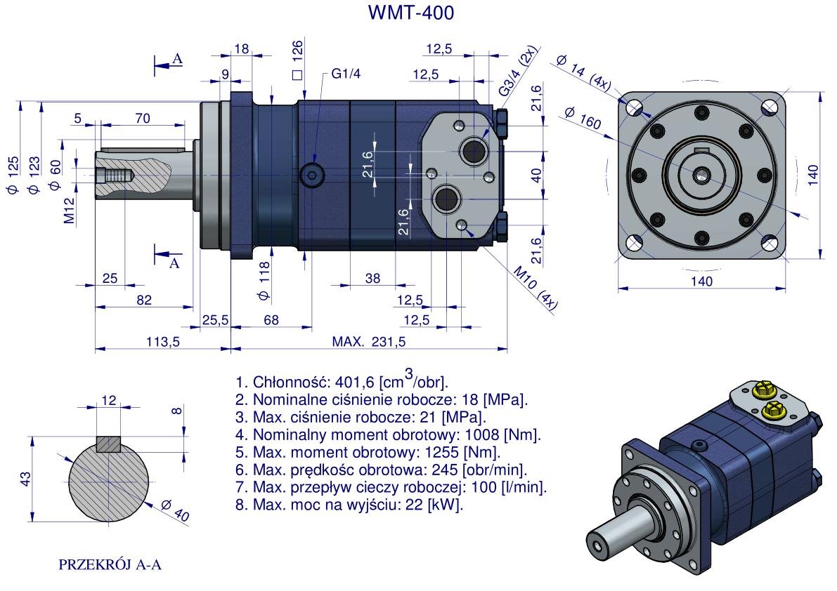 Silnik hydrauliczny orbitalny WMT 400 cm³/obr (180 bar / max.210 bar / max.chwilowe 240 bar) Waryński. Silniki serii WMT charakteryzują się kompaktową konstrukcją, wysokim momentem obrotowym, dużą chłonnością. Pracują w zakresie znacznych momentów obrotowych przy raczej niskich prędkościach obrotowych. Możliwość połączenia równolegle lub szeregowo. Dystrybucja dyskowa zapewnia wysoką efektywność, sprawność, płynną pracę oraz długą żywotność. W celu osiągnięcia dłuższej żywotności zaleca się, aby opytamalne waryunki pracy były na poziomie 1/3 do 2/3 parametrów maksymalnych.