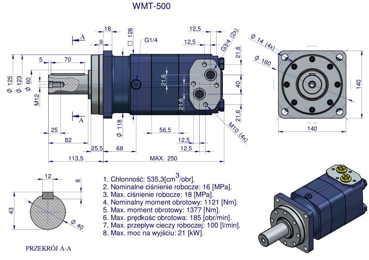 Silnik hydrauliczny orbitalny WMT 500 cm³/obr (160 bar / max.180 bar / max.chwilowe 210 bar) Waryński. Silniki serii WMT charakteryzują się kompaktową konstrukcją, wysokim momentem obrotowym, dużą chłonnością. Pracują w zakresie znacznych momentów obrotowych przy raczej niskich prędkościach obrotowych. Możliwość połączenia równolegle lub szeregowo. Dystrybucja dyskowa zapewnia wysoką efektywność, sprawność, płynną pracę oraz długą żywotność. W celu osiągnięcia dłuższej żywotności zaleca się, aby opytamalne waryunki pracy były na poziomie 1/3 do 2/3 parametrów maksymalnych.