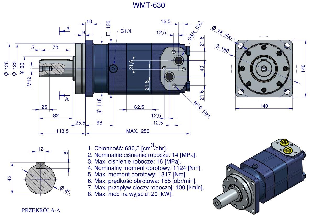 Silnik hydrauliczny orbitalny WMT 630 cm³/obr (160 bar / max.180 bar / max.chwilowe 210 bar) Waryński. Silniki serii WMT charakteryzują się kompaktową konstrukcją, wysokim momentem obrotowym, dużą chłonnością. Pracują w zakresie znacznych momentów obrotowych przy raczej niskich prędkościach obrotowych. Możliwość połączenia równolegle lub szeregowo. Dystrybucja dyskowa zapewnia wysoką efektywność, sprawność, płynną pracę oraz długą żywotność. W celu osiągnięcia dłuższej żywotności zaleca się, aby opytamalne waryunki pracy były na poziomie 1/3 do 2/3 parametrów maksymalnych.