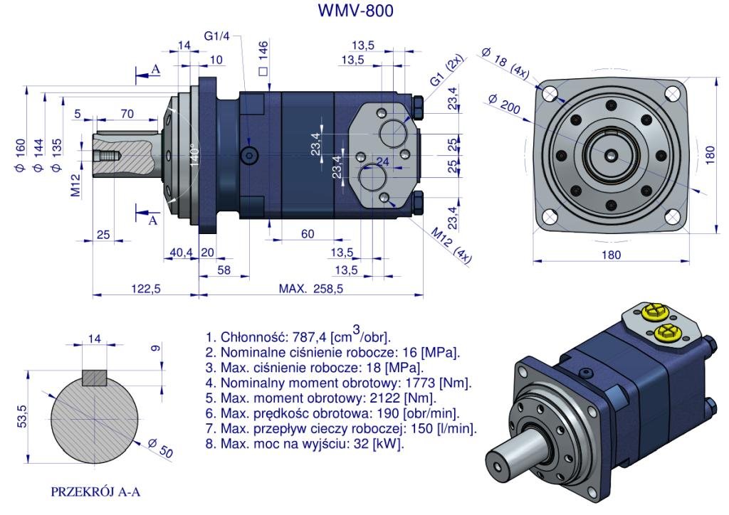 Silnik hydrauliczny orbitalny WMV 800 cm3/obr (160 bar / max.210 bar) Waryński. Silniki serii WMV mają kompaktową konstrukcję, wysoki moment obrotowy oraz dużą chłonność. Możliwość połączenia równolegle lub szeregowo. W celu osiągnięcia dłuższej żywotności zaleca się, aby opytamalne waryunki pracy były na poziomie 1/3 do 2/3 parametrów maksymalnych. Silniki serii WMV charakteryzują się płynną pracą, sprawnością, przenoszeniem wysokich obciążeń wzdłużnych i poprzecznych.