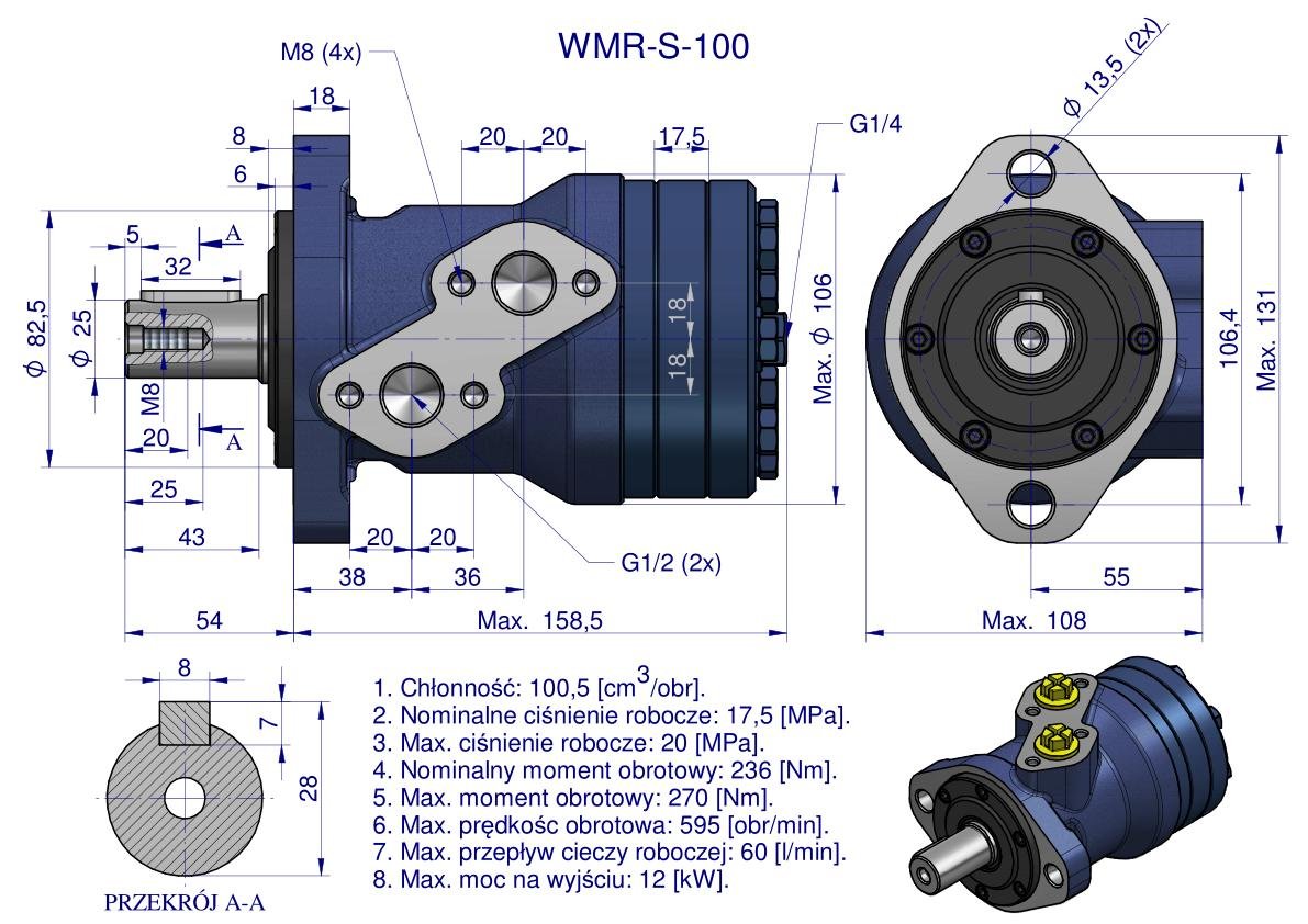 Silnik hydrauliczny orbitalny wzmacniany WMR-S 100 cm³/obr (175 bar / 200 bar / max.chwilowe 220 bar) Waryński. Silniki serii WMR-S mają lekką kompaktową konstrukcję, wysoki moment obrotowy. Możliwość połączenia równolegle lub szeregowo. W celu osiągnięcia dłuższej żywotności zaleca się, aby opytamalne waryunki pracy były na poziomie 1/3 do 2/3 parametrów maksymalnych. Silniki Serii WMR-S mają wzmocnioną konstrukcję – dzięki czemu zostały podniesione parametry pracy: ciśnienie, moment obrotowy i moc w stosunku do silników serii WMR.