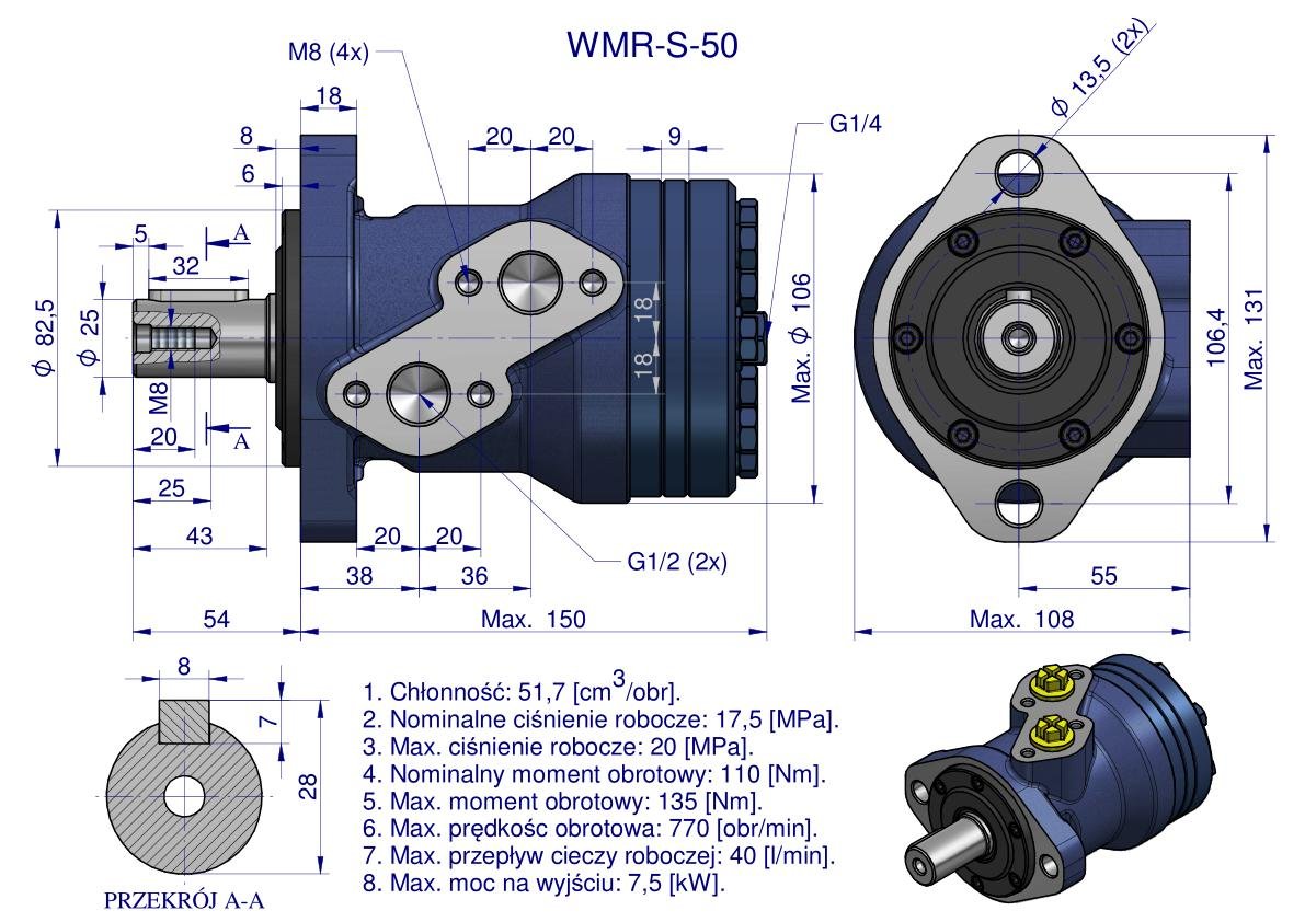Silnik hydrauliczny orbitalny wzmacniany WMR-S 50 cm³/obr (175 bar / 200 bar / max.chwilowe 220 bar) Waryński. Silniki serii WMR-S mają lekką kompaktową konstrukcję, wysoki moment obrotowy. Możliwość połączenia równolegle lub szeregowo. W celu osiągnięcia dłuższej żywotności zaleca się, aby opytamalne waryunki pracy były na poziomie 1/3 do 2/3 parametrów maksymalnych. Silniki Serii WMR-S mają wzmocnioną konstrukcję – dzięki czemu zostały podniesione parametry pracy: ciśnienie, moment obrotowy i moc w stosunku do silników serii WMR.
