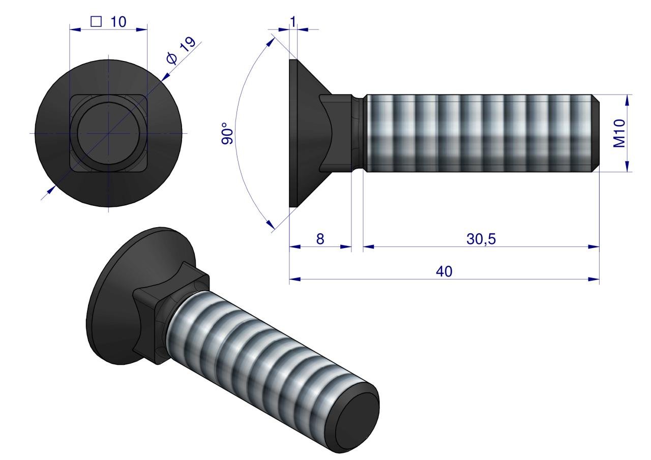 Śruba kpl. płużna podsadzana D 608 M10x40 mm kl.10.9 Waryński ( sprzedawane po 25 ) [W-608101040]