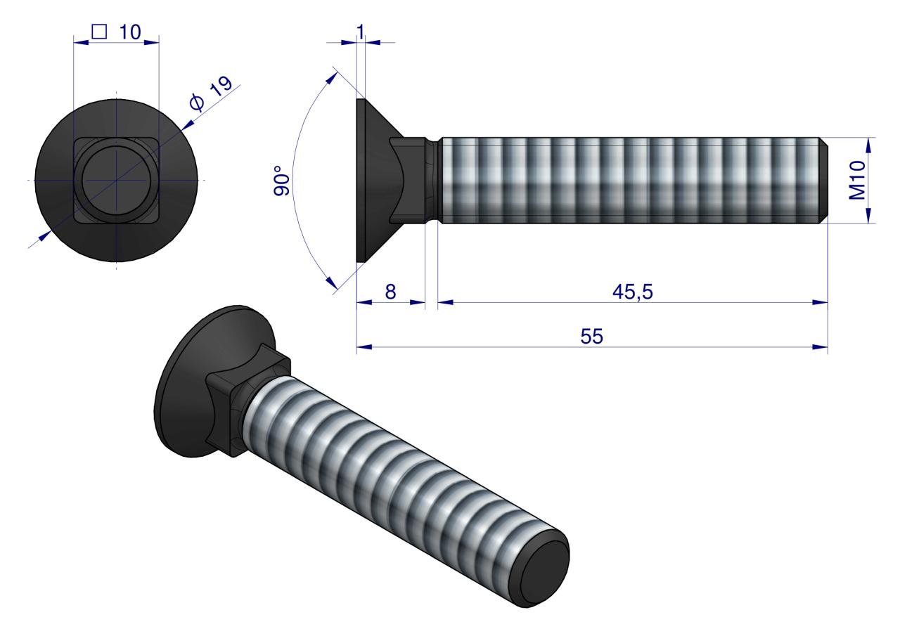 Śruba kpl. płużna podsadzana D 608 M10x55 mm kl.10.9 Waryński ( sprzedawane po 25 ) [W-608101055]