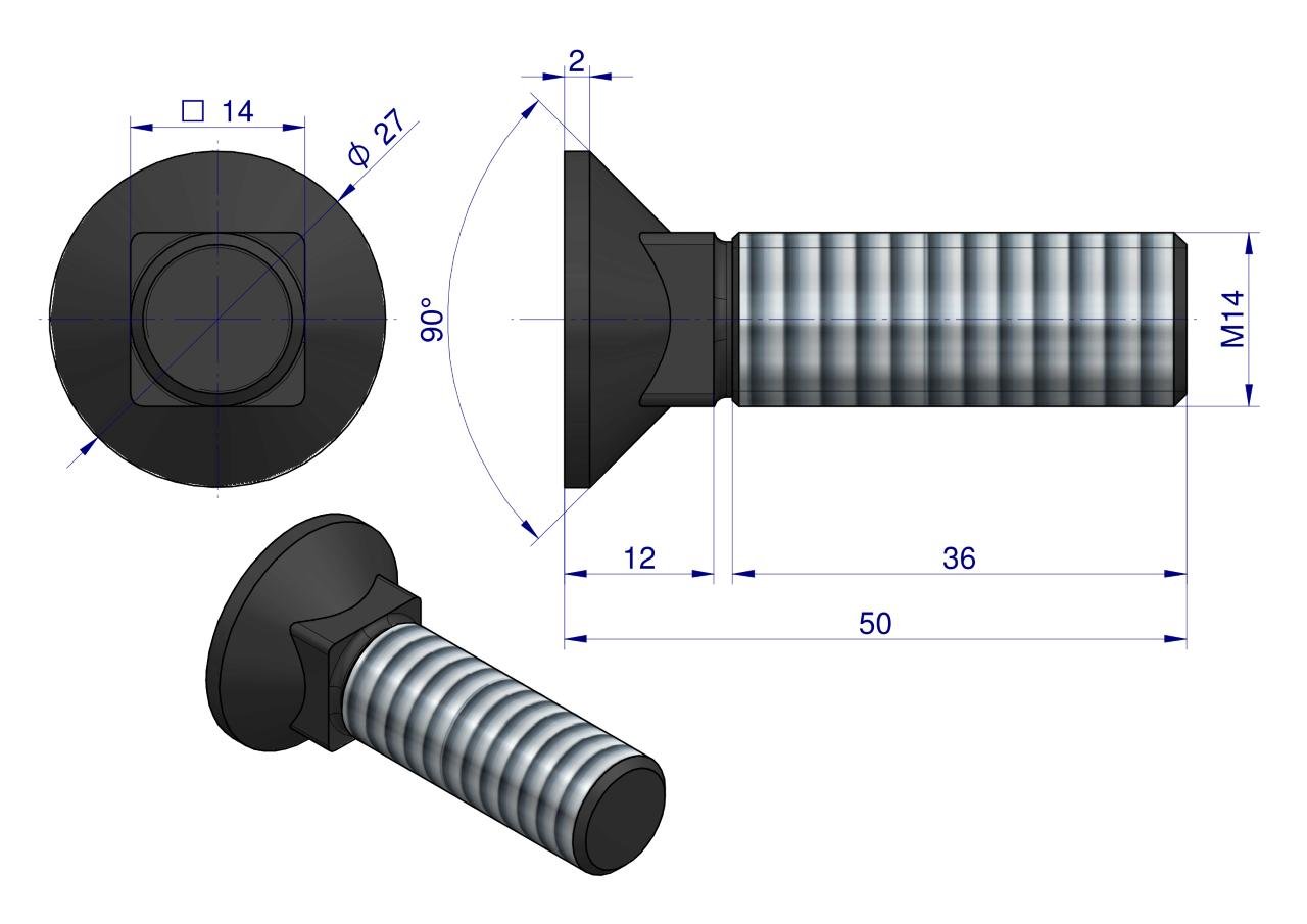 Śruba kpl. płużna podsadzana D 608 M14x50 mm kl.10.9 Waryński ( sprzedawane po 10 ) [W-608101450]