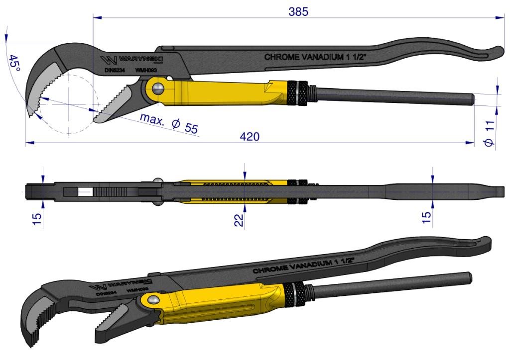 Szczypce nastawne szwedzkie do rur szczęki typ 45° o rozstawie max 55mm długość 420mm Waryński [WMH093]