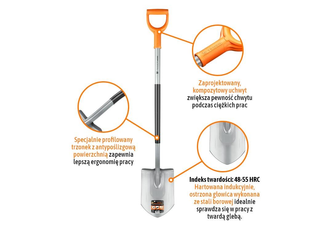 Szpadel szpiczasty na metalowym trzonku Extreme / TEGER jeszcze bardziej trwały i wytrzymały, głowica wykonana ze stali, hartowana indukcyjnie w zakresie 42-48 HRC o podwyższonej wytrzymałości na ścieranie. Przeznaczony do pracy w wymagającej, bardzo twardej glebie, umożliwia łatwe i bezpieczne wykopywanie, sadzenie, przekopywanie oraz usuwanie korzeni. Odpowiednio dobrana długość, specjalnie wyprofilowany trzonek, ergonomiczny specjalnie zaprojektowany uchwyt Extreme oraz kąt nachylenia minimalizuje napięcie pleców i ramion. Szpadel pokryty jest powłoką odporna na zarysowania ułatwiającą pracę z materiałami sypkimi i o podwyższonej lepkości. Indeks rączki T-O-RACZ-EXT – (na trzonek przetłoczony Extreme) lub T-O-RACZ032P-EXT – (na trzonek FI32 Extreme)