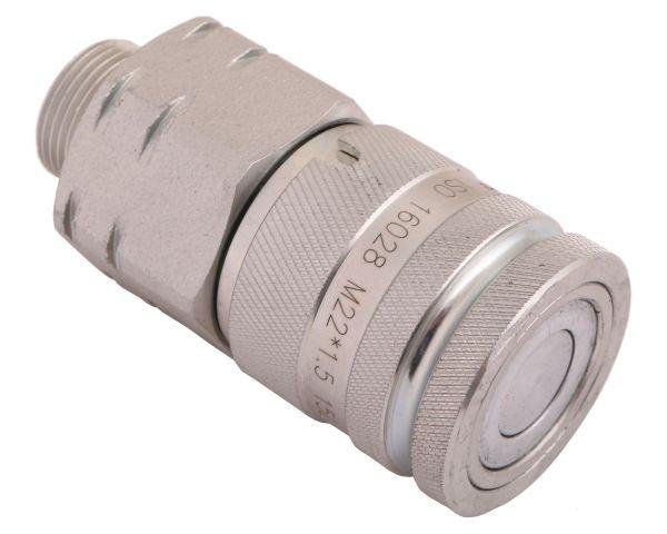 Szybkozłącze hydrauliczne suchoodcinające gniazdo M22x1.5 15L gwint zewnętrzny ISO16028 Waryński. Posiadają trzpień zabezpieczający przed przypadkowym rozłączeniem. Szybkozłącza zaprojektowane są zgodnie z wymogami wymiarowymi i jakościowymi normy ISO 16028 Seria F, która określa szczegółowo charakterystykę i wymiary, aby umożliwić kompatybilność szybkozłączy produkowanych przez różnych producentów zgodnie z tym standardem. Zamienne z szybkozłączami ISO-F innych producentów takich jak: Parker, Faster, Stucchi, DNP, Tema i innych.