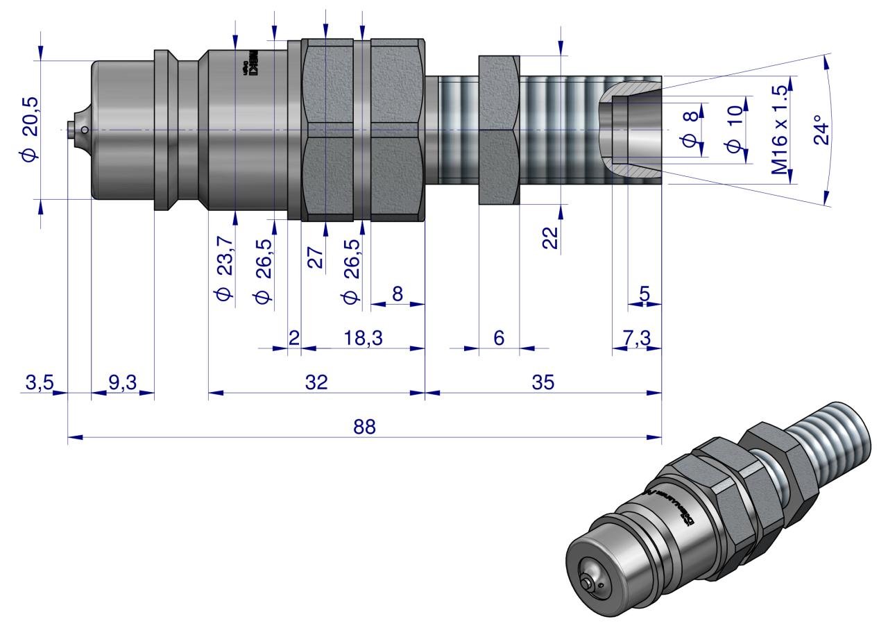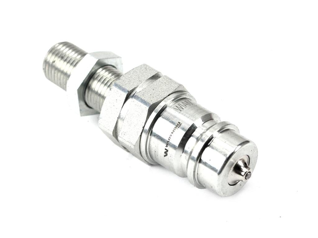 Szybkozłącze hydrauliczne wtyczka long z eliminatorem ciśnienia M16x1.5 gwint zew. EURO (9100818W) (ISO 7241-A) Waryński. Eliminator ciśnienia umożliwia połączenie hydrauliki bez potrzeby stosowania nadmiernej siły, co zapewnia szybki i łatwy proces połączenia w każdej sytuacji (statyczne ciśnienie pomiędzy dwoma systemami hydraulicznymi jest rozprężane). Jest to idealne rozwiązanie łączenia hydrauliki o bardzo szerokim spektrum zastosowań. Szybkozłącza zaprojektowane są zgodnie z wymogami wymiarowymi i jakościowymi normy ISO 7241 Seria A, która określa szczegółowo charakterystykę i wymiary, aby umożliwić kompatybilność szybkozłączy produkowanych przez różnych producentów zgodnie z tym standardem.