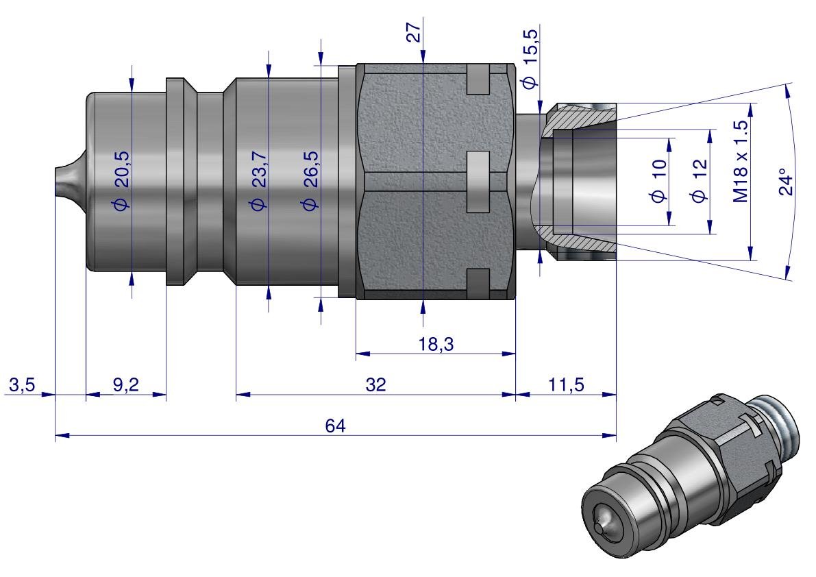 Szybkozłącze hydrauliczne wtyczka M18x1.5 gwint zewnętrzny EURO (9100818W) (ISO 7241-A) Waryński (opakowanie 50szt). Najpopularniejsze szybkozłącza hydrauliczne o bardzo szerokim spektrum zastosowań. Szybkozłącza zaprojektowane są zgodnie z wymogami wymiarowymi i jakościowymi normy ISO 7241 Seria A, która określa szczegółowo charakterystykę i wymiary, aby umożliwić kompatybilność szybkozłączy produkowanych przez różnych producentów zgodnie z tym standardem. Zamienne z szybkozłączami ISO-A innych producentów takich jak: Parker, Faster, Stucchi, DNP, Tema i innych.