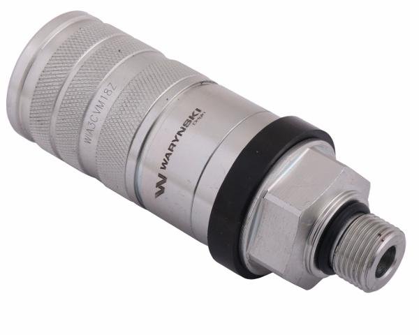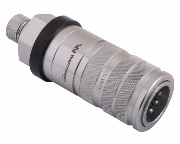 Szybkozłącze hydrauliczne zrywalne seria WIA3CV (3CFPV) gniazdo M18x1.5 gwint zewnętrzny EURO PUSH-PULL (ISO 7241-A) Waryński. Najpopularniejsze szybkozłącza hydrauliczne o bardzo szerokim spektrum zastosowań w najnowszych ciągnikach rolniczych. Ten rodzaj wykonania gniazda szybkozłącza zabezpiecza przed pęknięciem/zerwaniem przewodu hydraulicznego i utratą oleju hydraulicznego w przypadku jego niezamierzonego naciągnięcia – np. odjazd ciągnika bez odczepienia hydrauliki z podłączonej maszyny (montaż gniazda na sztywno bez dodatkowych uchwytów). Szybkozłącza zaprojektowane są zgodnie z wymogami wymiarowymi i jakościowymi normy ISO 7241 Seria A, która określa szczegółowo charakterystykę i wymiary. Zamienne z szybkozłączami innych renomowanych producentów takich jak: Parker, Faster, Stucchi, DNP i innych.