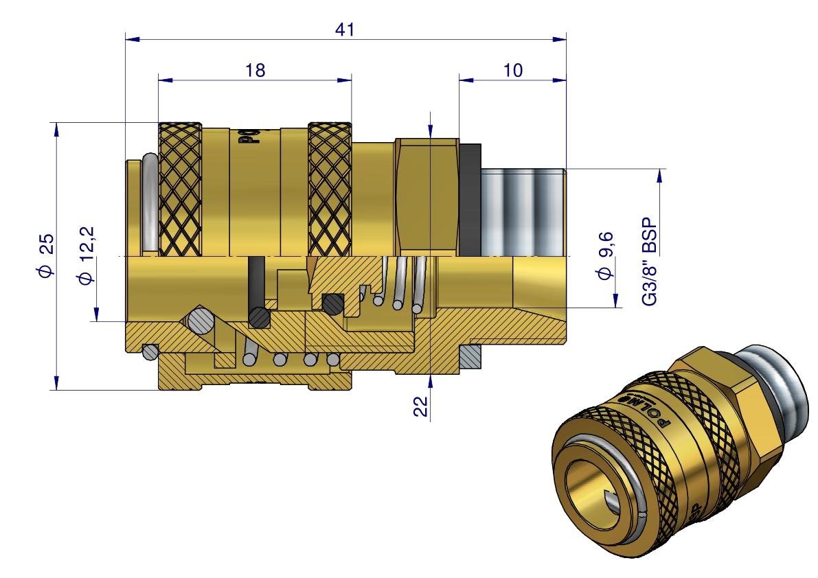 Szybkozłącze pneumatyczne P26 NW7.2 gniazdo 3/8″BSP gwint zewnętrzny POLMO – najpopularniejsze szybkozłącza mosiężne o bardzo szerokim spektrum zastosowań. Szybkozłącza zaprojektowane są zgodnie z wymogami wymiarowymi i jakościowymi zgodnymi ze standardowym profilem EURO, który określa szczegółowo charakterystykę i wymiary. Kompatybilność szybkozłączy produkowanych przez różnych producentów zgodnie z tym standardem. Zamienne z szybkozłączami serii P26 z: RECTUS, CEJN i innych.