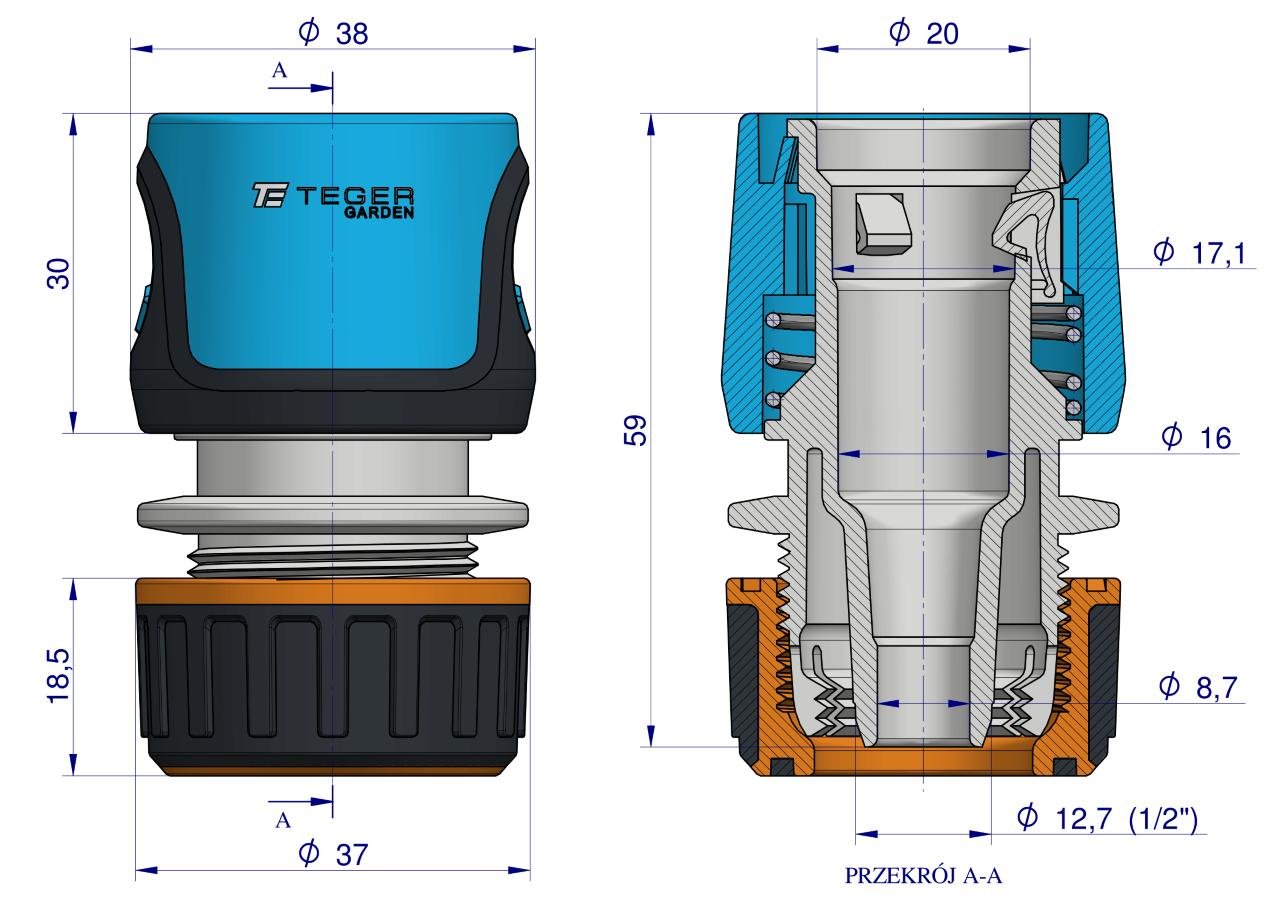 Szybkozłączka 1/2″ / TEGER / Wysokiej jakości szybkozłącze na wąż 1/2″ które zamontowane na końcach węża, umożliwia szybkie przyłączenie innych elementów systemu nawadniającego. Szybkozłącze wyposażone jest w odpowiednio wyprofilowane ząbki, które zapewniają solidny montaż węży o cienkich ściankach. Specjalnie uformowana nakrętka zapewnia idealne połączenie z wężem i bezproblemowy montaż. Żłobiony uchwyt z tworzywa ABS pokrytego gumą termoplastyczną (TPR) gwarantuje wygodną obsługę.