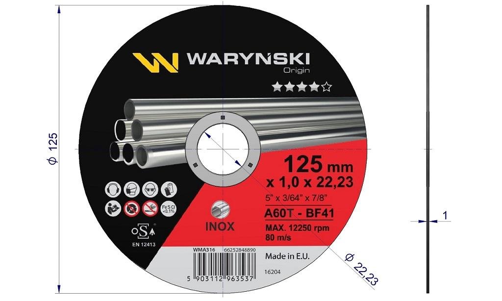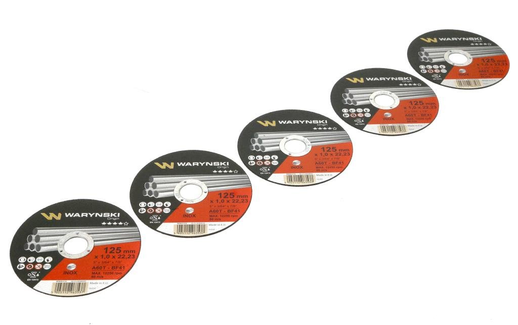 Tarcza do cięcia inoxu 125 x1.0 x22.23 mm odpowiednio dobrana szybkość cięcia do zużywania się, standard bezpieczeństwa oSa Waryński (sprzedawane po 5 szt)