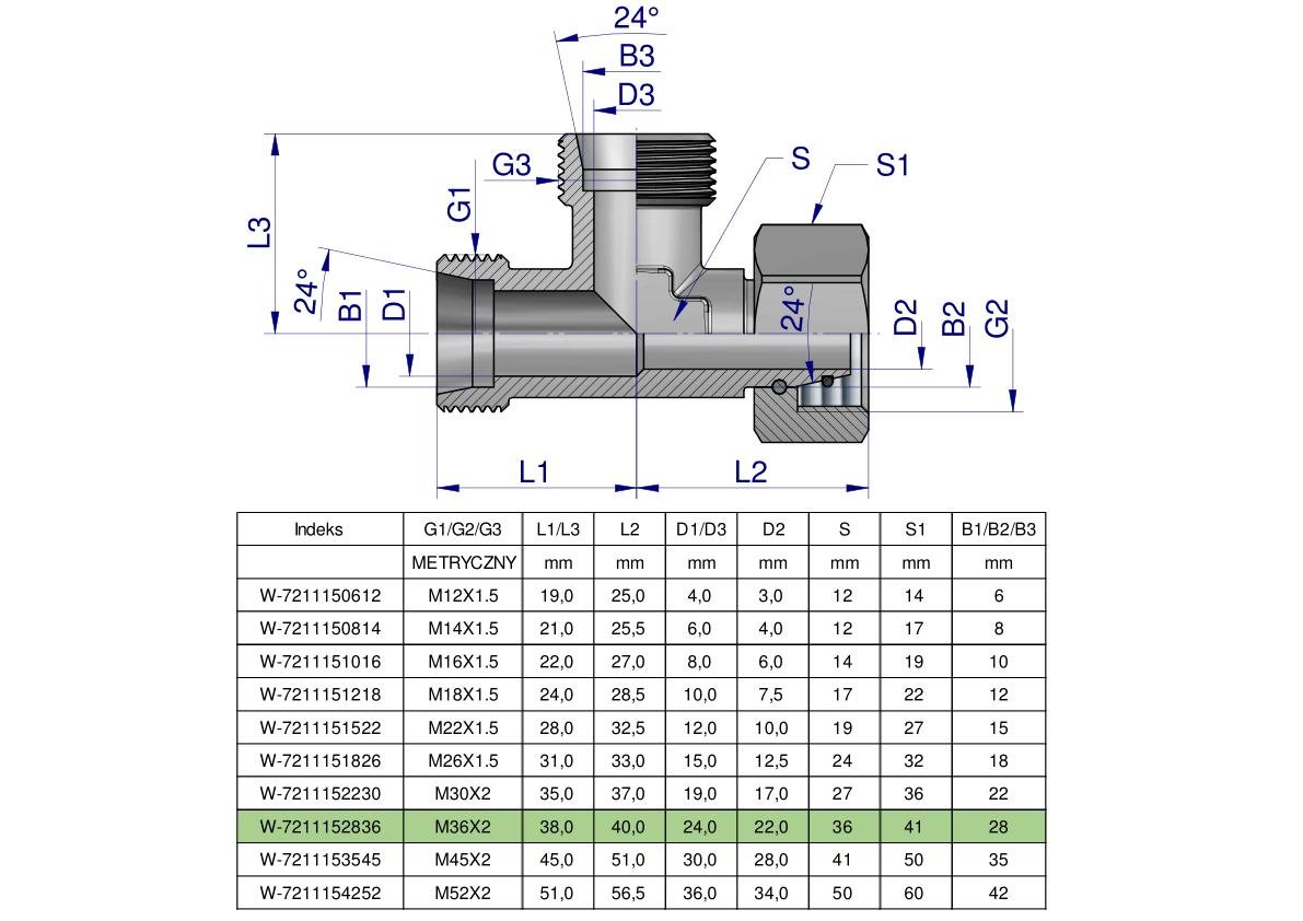 Trójnik hydrauliczny niesymetryczny metryczny BBA M36x2 28L (XEVL) Waryński [W-7211152836]