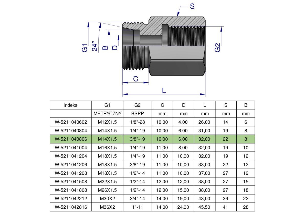 Tulejka różnicowa hydrauliczna AB M14x1.5 08L GZ x 3/8″ BSP GW Waryński. Elementy złączne zostały zaprojektowane i wykonane zgodnie z obowiązującymi normami, które szczegółowo opisują wymagania jakościowe i wymiarowe. Są kompatybilne z elementami złącznymi innych renomowach producentów hydrauliki siłowej.